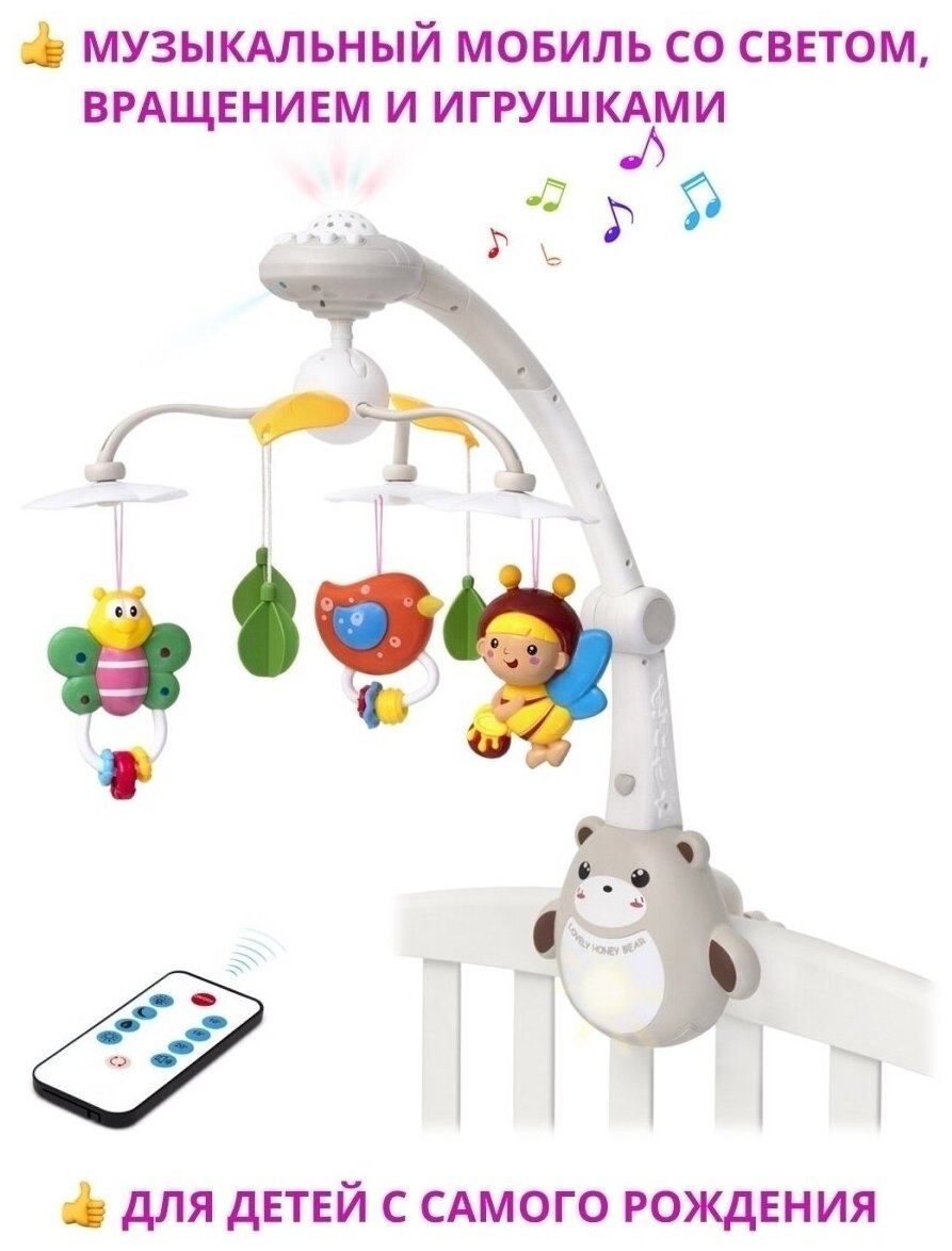| Особенности | звуки природы / звуковые эффекты / ночник / проектор / пульт ДУ / регулировка высоты мобиля / регулировка громкости / световые эффекты / съемные игрушки / таймер автоотключения |