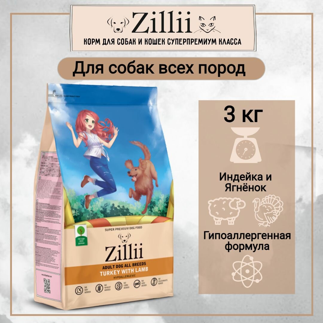 ZILLII (Зилли) Adult Dog корм для взрослых собак сухой 3 кг Индейка с Ягнёнком, гипоаллергенный