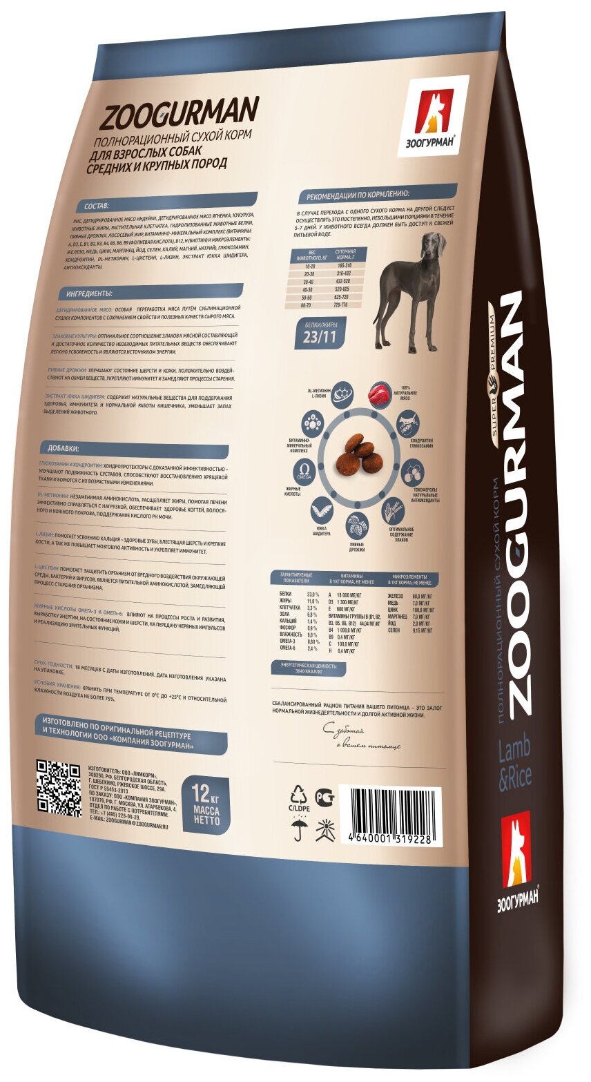 Корм сухой Зоогурман для собак средних и крупных пород Ягненок с рисом 12кг / 1 шт