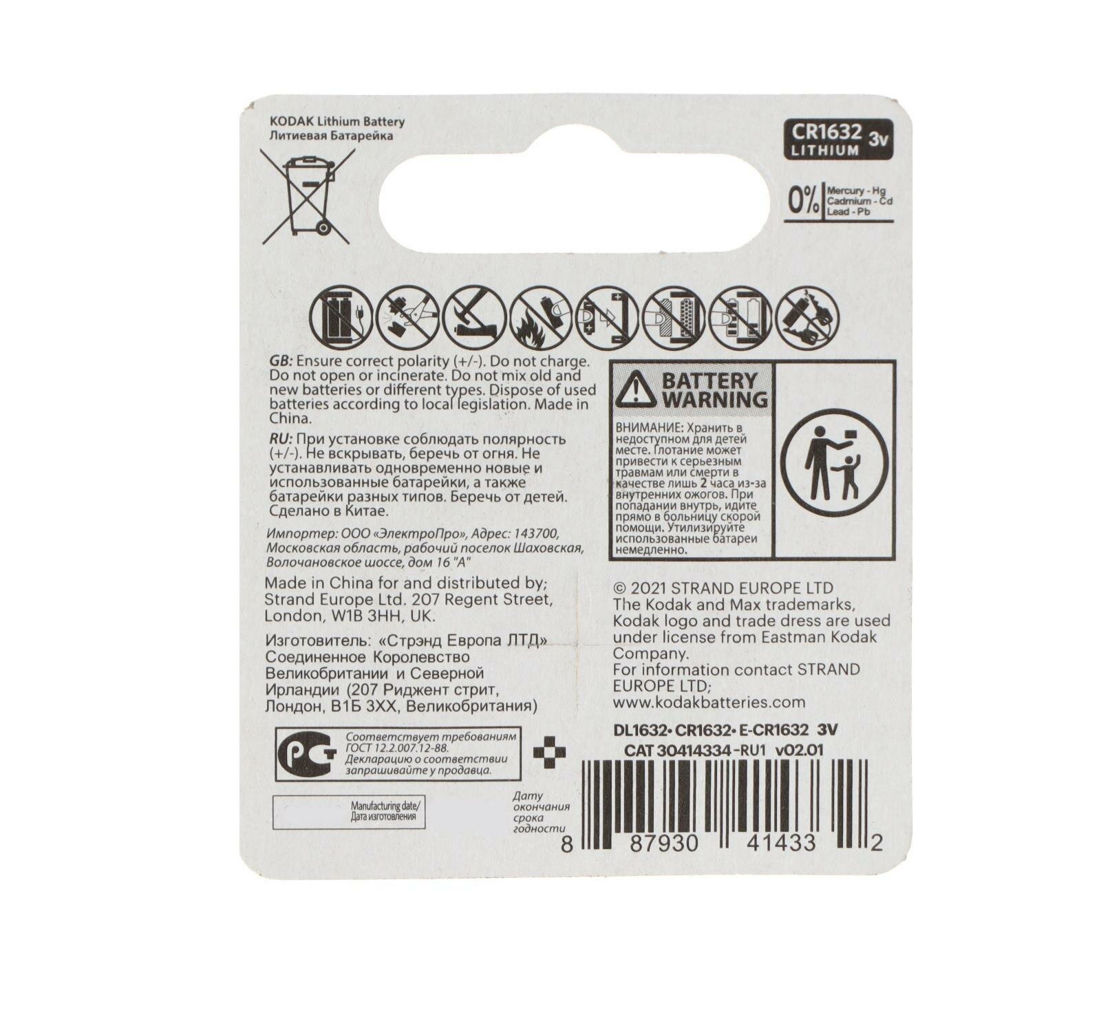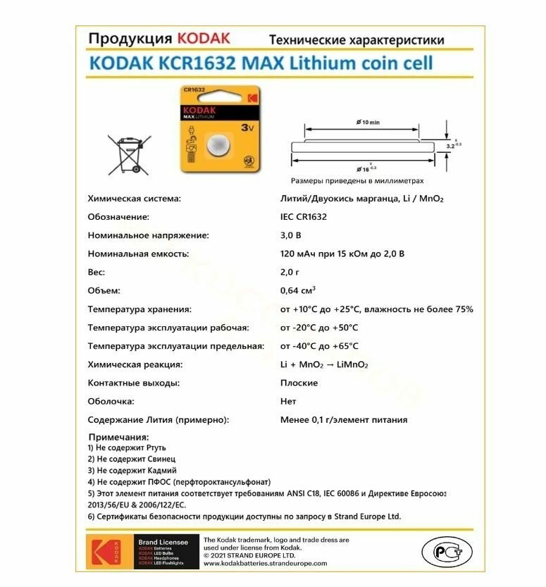 Батарейки Kodak CR1632-1BL MAX Lithium арт. Б0029113 (1 шт.) интересное: