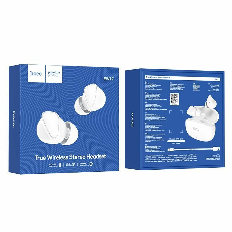HOCO EW17 Беспроводные Bluetooth-наушники с кейсом, 350mAh, 4ч работы, белые