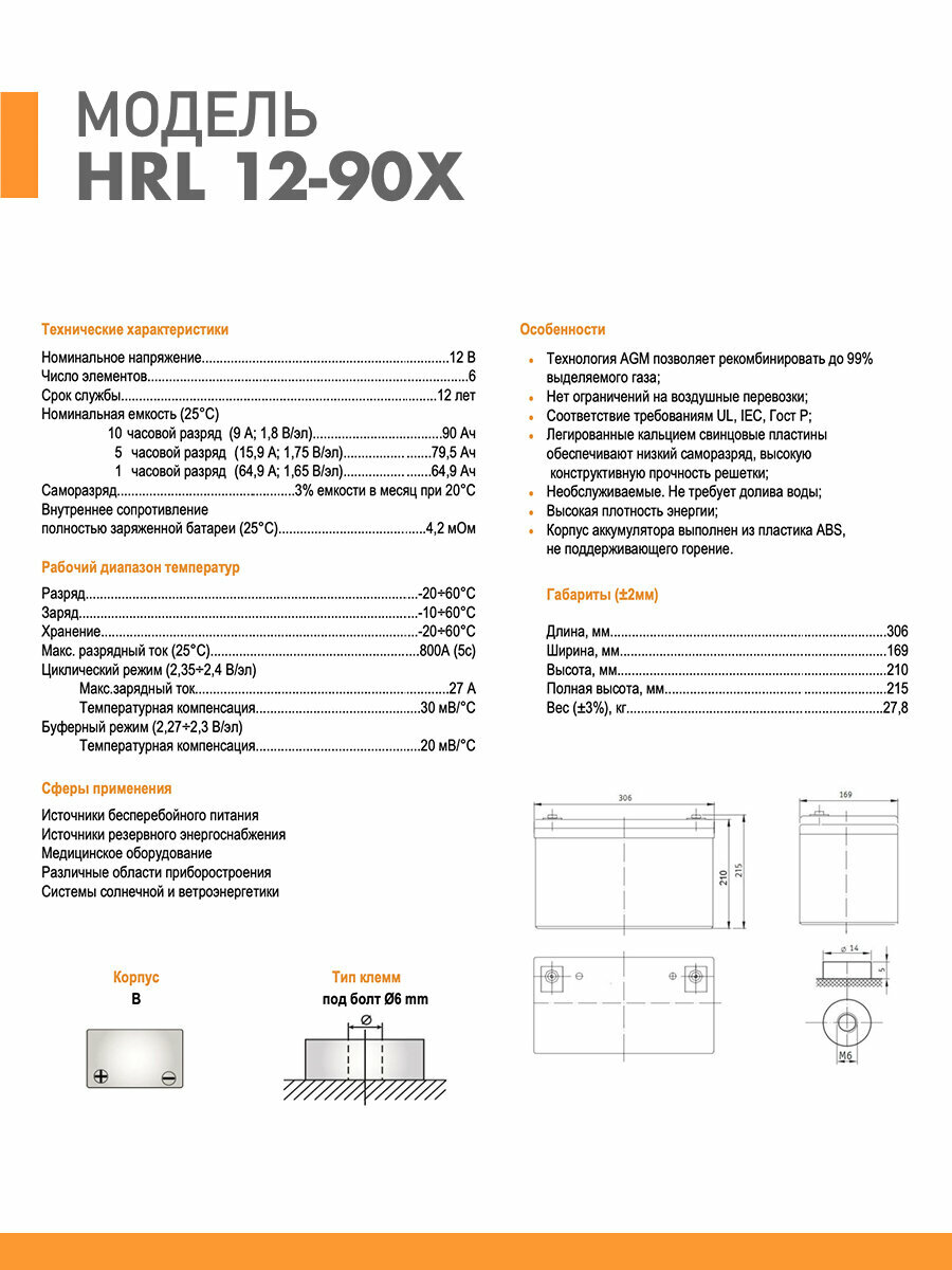 Аккумуляторная батарея Delta HRL 12-90 X 12В/90Ач, клемма Болт М6 (306х169х210мм (215мм); 27,8кг; Срок службы 12лет; Гар