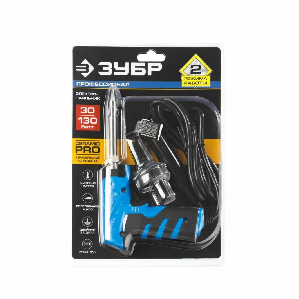 Паяльник ЗУБР "Профессионал" "турбо", 2 уровня мощности, пистолетная рукоятка, 30Вт и 130Вт, конус