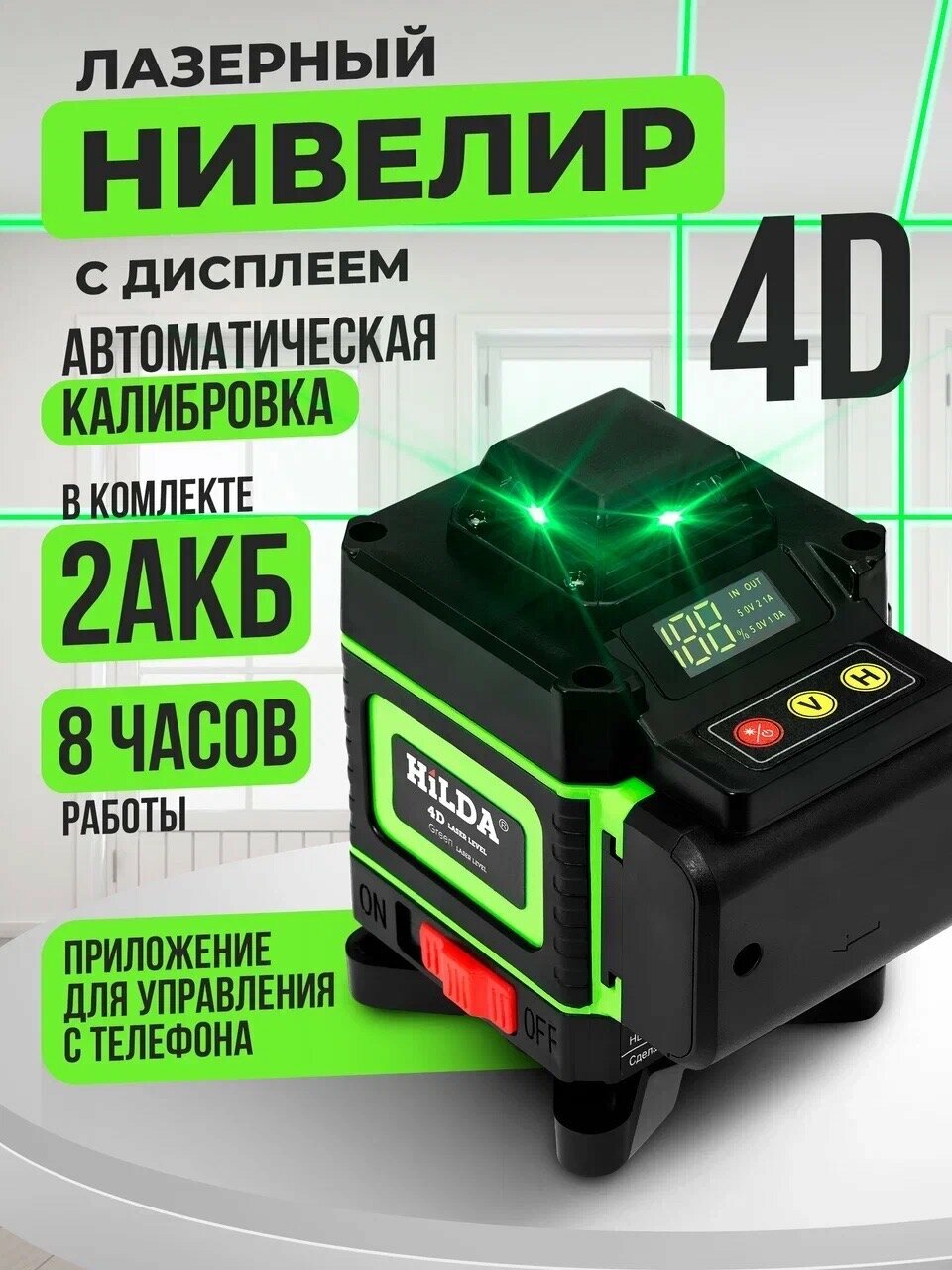 Лазерный уровень HILDA 4D, 16 линий, 2 аккумулятора 3000 мА·ч, зеленый луч, калибровка интересное: