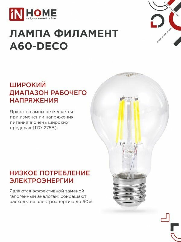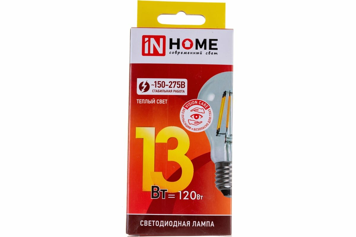 Лампа светодиодная IN HOME LED-A60-deco, 13 Вт, 230 В, Е27, 3000 К, 1370 Лм, прозрачная