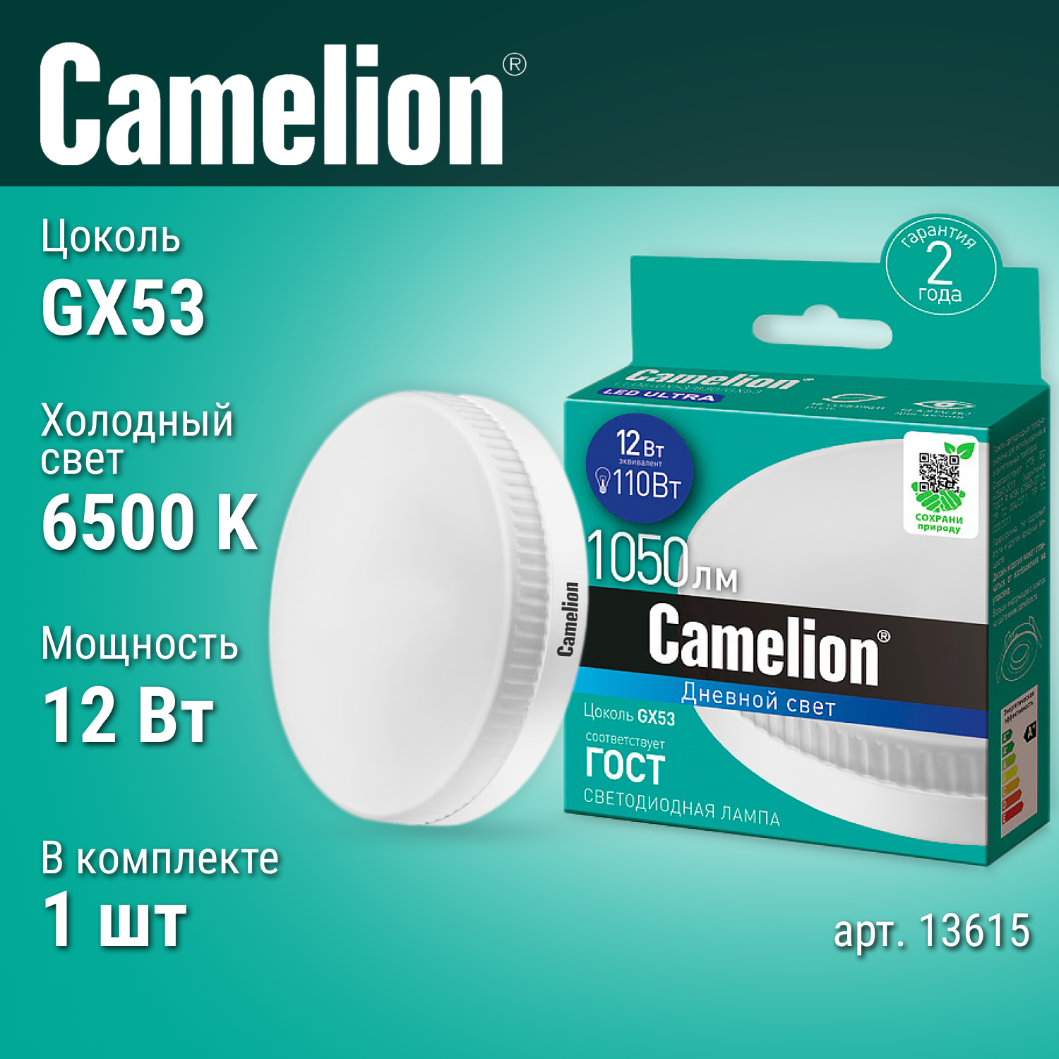 Лампа светодиодная GX53 Camelion Таблетка, 12Вт, 6500К, лампочка 1 шт. 13615