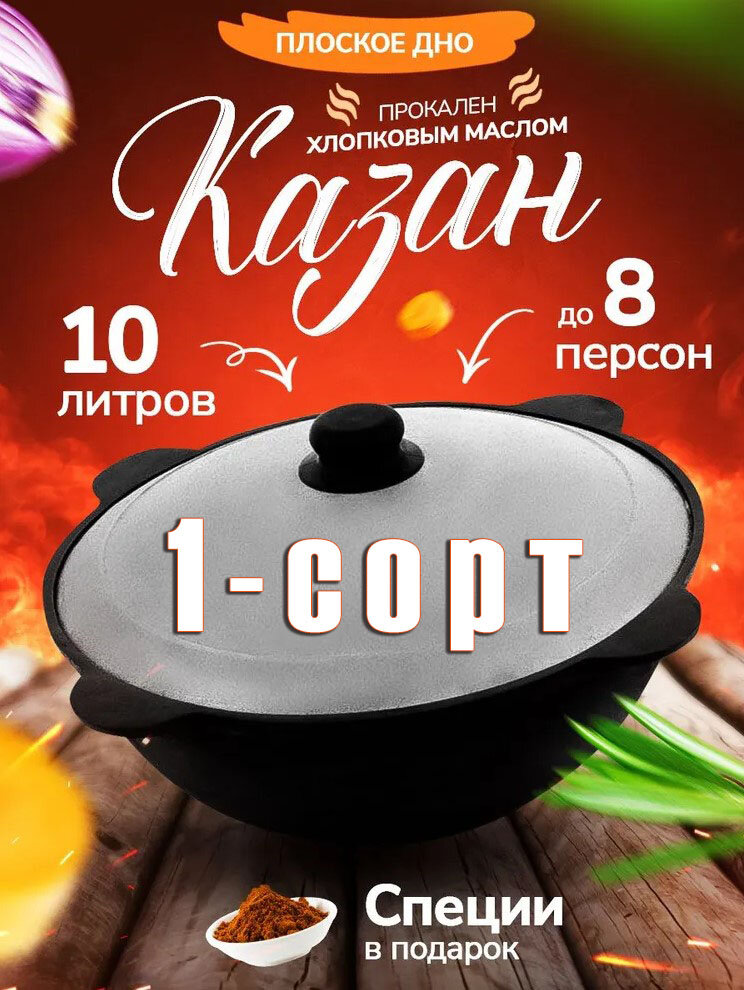 Узбекский чугунный казан (плоское дно) 10 л с крышкой Наманган