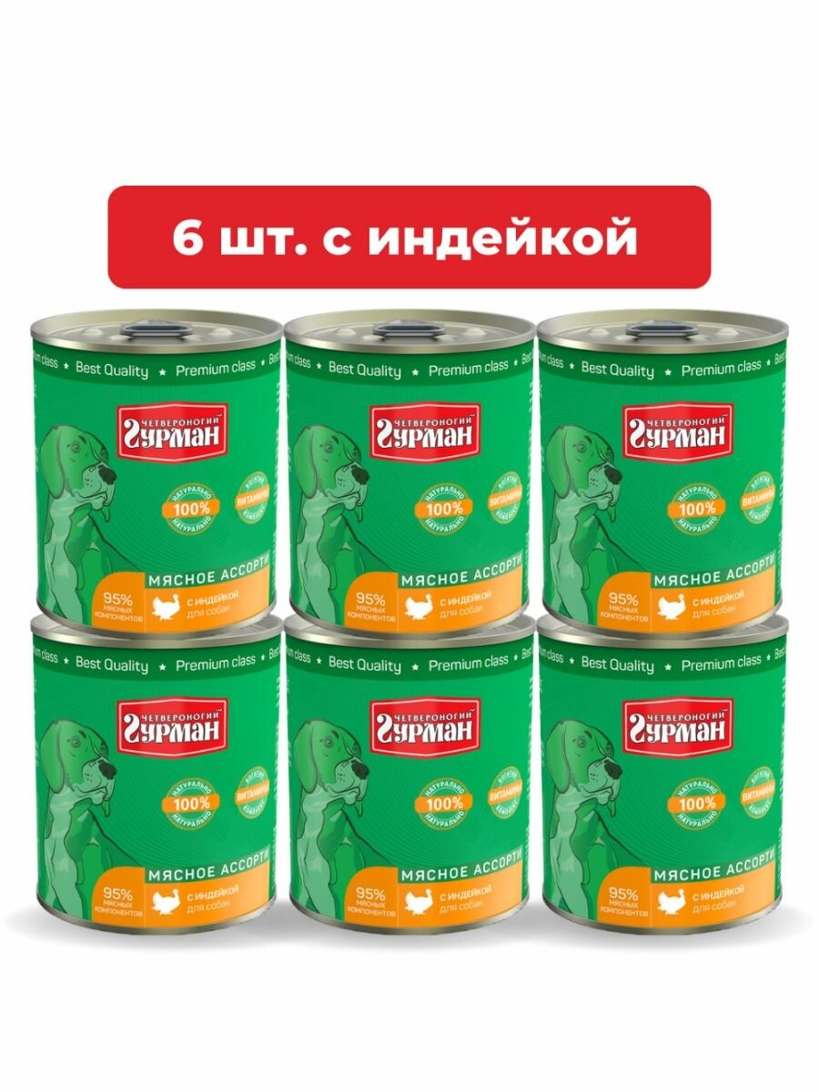 Четвероногий Гурман Корм консервированный для собак Мясное ассорти с Индейкой, 100 г, 6 шт