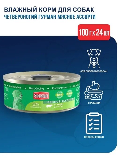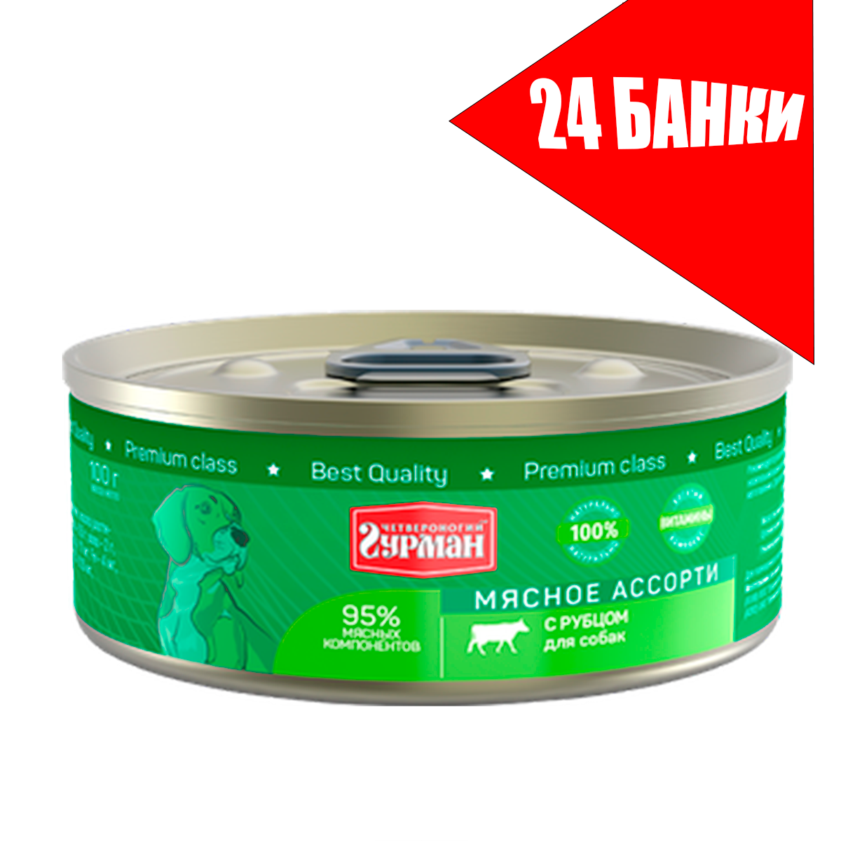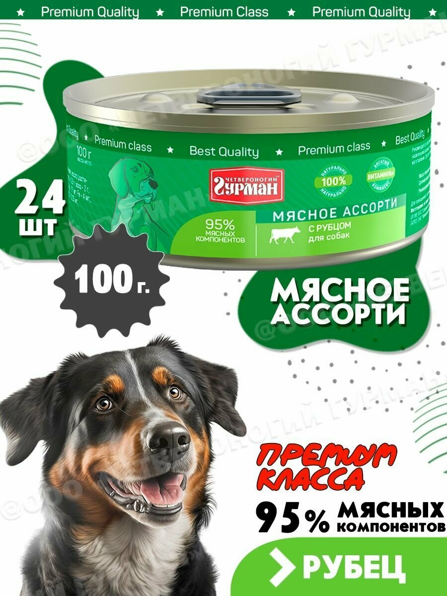 Купить Четвероногий Гурман для собак Мясное ассорти с Рубцом, консервы 100г (24 банки)