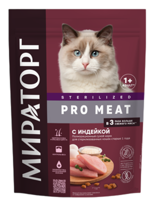 Сухой корм мираторг PRO MEAT STERILIZED для взрослых кастрированных котов и стерилизованных кошек с индейкой (0,4 кг)