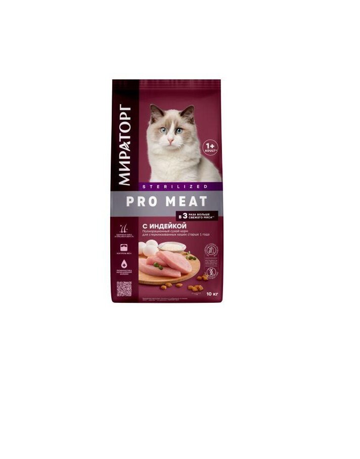 Корм сухой мираторг Pro Meat с индейкой для стерилизованных кошек старше 1года, 10 кг