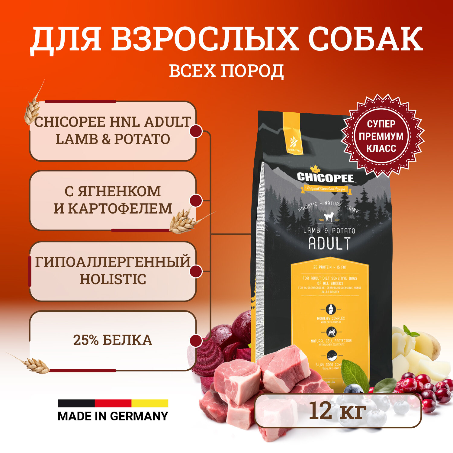 CHICOPEE HOLISTIC NATURE LINE ADULT LAMB & POTATO беззерновой для взрослых собак всех пород с ягненком и картофелем (12 кг)