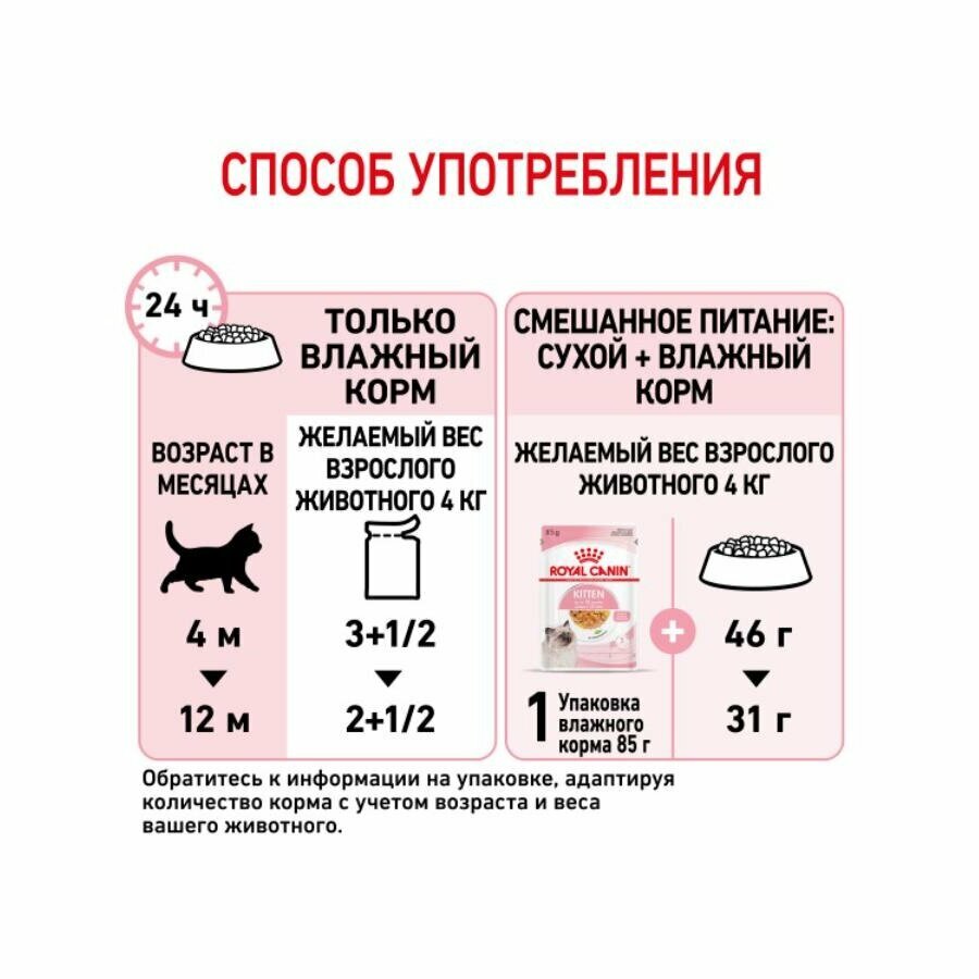| Дозировка | Специально для котят в период до 12 месяцев, кусочки в желе. Рекомендуемую суточную порцию можно разделить на 2-3 кормления. Индивидуальные потребности в питании могут отличаться в зависимости от размера, возраста и уровня активности животного. Данные предписания носят исключительно рекомендательный характер. Для достижения оптимального состояния животного может потребоваться изменения рациона. |