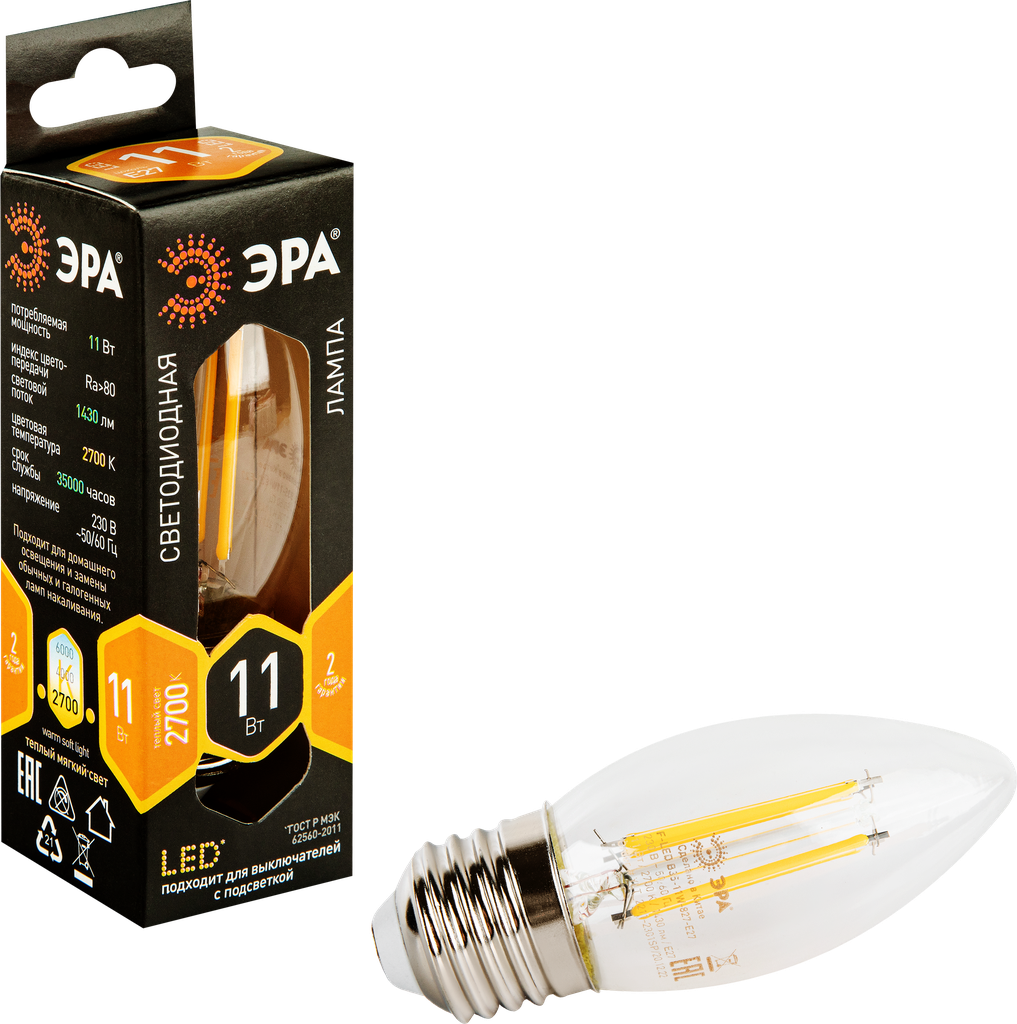 Лампа светодиодная ЭРА Б0046986, E27, B35, 11 Вт, 2700 К