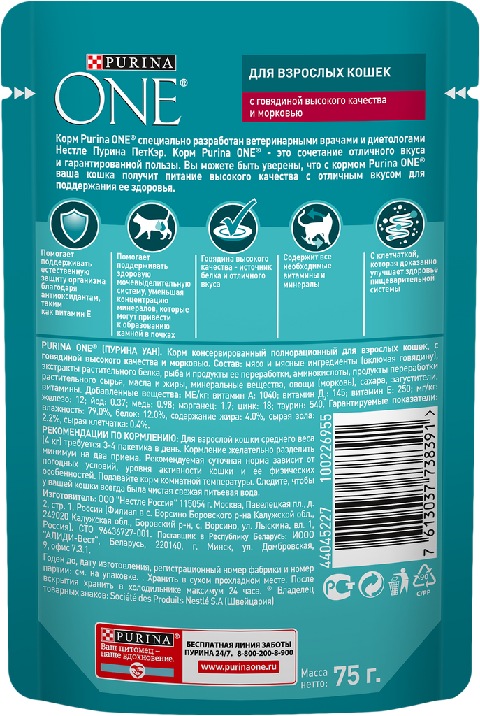 PURINA ONE для взрослых кошек с говядиной и морковью пауч 75 гр 75 гр х 10 шт