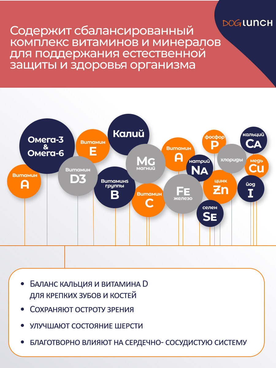 | Дополнительная информация | Органолептические свойства: Светло-коричневая гранулы диаметром 12 мм. Переход с предыдущего рациона следует осуществлять постепенно, небольшими порциями в течение 5-7 дней. Если вы уже используете любой из сухих кормов Dog Lunch, то можно безопасно чередовать вкусы в рамках возрастной линейки без переходного периода. При кормлении необходимо учитывать активность, возраст размер и индивидуальные особенности Вашего питомца. У питомца всегда должен быть доступ к свежей питьевой воде. |