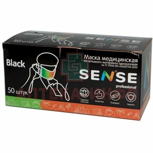 Маска медицинская из нетканого материала одноразовая черная Sense/Сенс 50шт