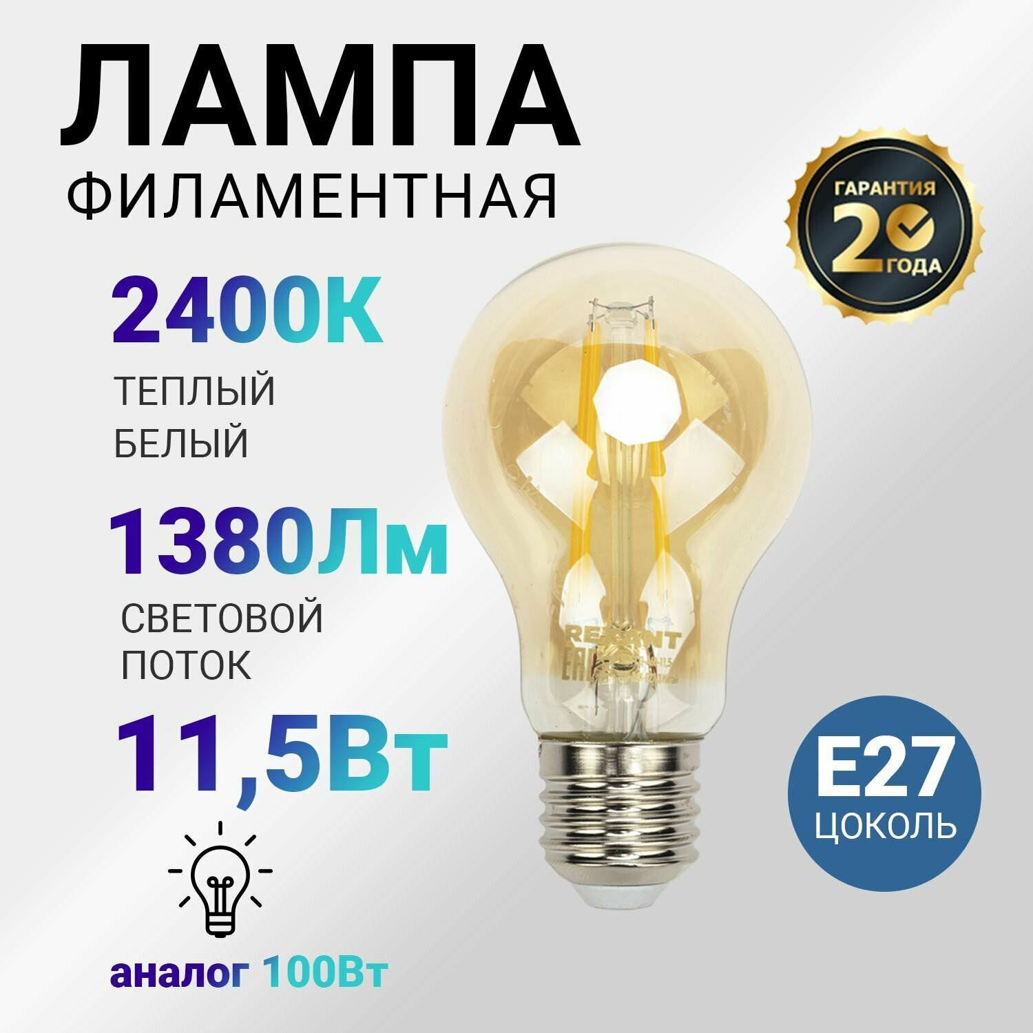 Лампа филаментная Rexant Груша A60 11.5 Вт 1380 Лм 2400K E27 золотистая колба {604-080}