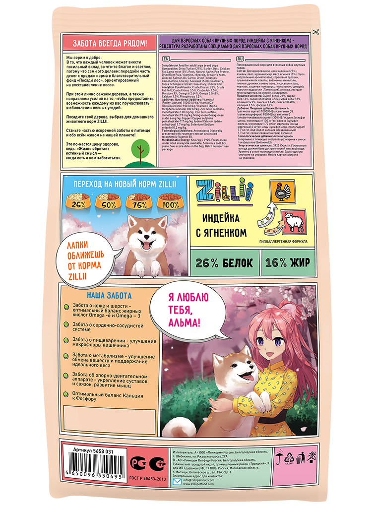 ZILLII 5658031/350495 Adult Dog Large Breed Сухой корм д/взрослых собак крупных пород Индейка с Ягнё