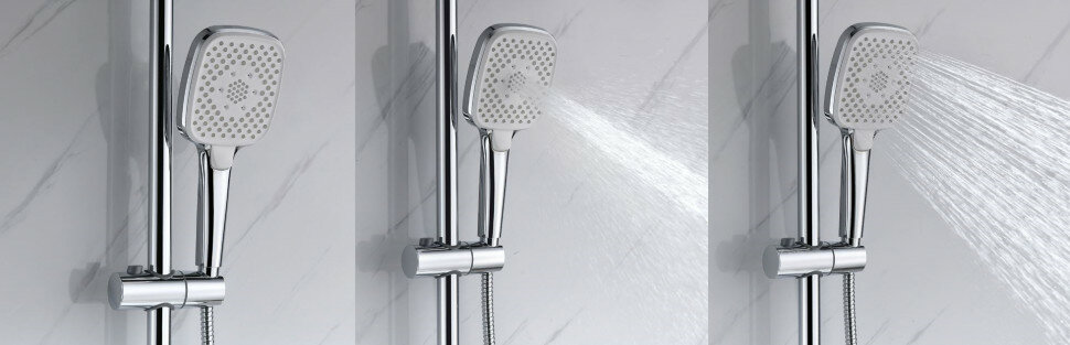 | Комплектация | аэратор / Керамический картридж 35 мм / трехпозиционный картриджный переключатель (угол поворота - 180?) / верхняя поворотная душевая лейка «Тропический дождь» 300х200 мм / 3-функциональная лейка 110x258 мм / регулируемое по высоте крепление для лейки / душевой шланг 1,5 м / присоединительная группа для настенного крепления |