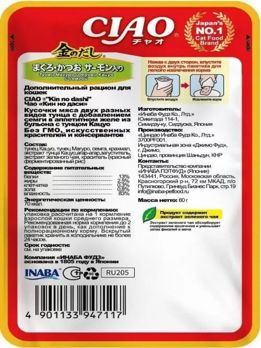 INABA Влажный корм для кошек, Ciao Kinnodashi, тунец магуро, тунец кацуо, семга, в желе, 60 г