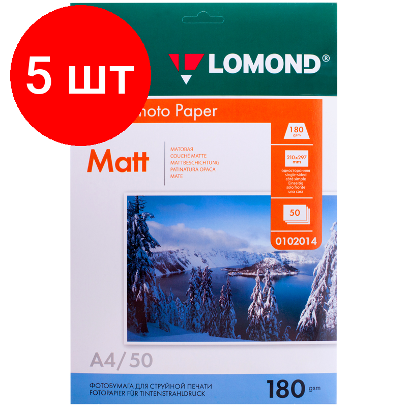 Комплект 5 штук, Фотобумага LOMOND односторонняя матовая 180г A4 50л 0102014