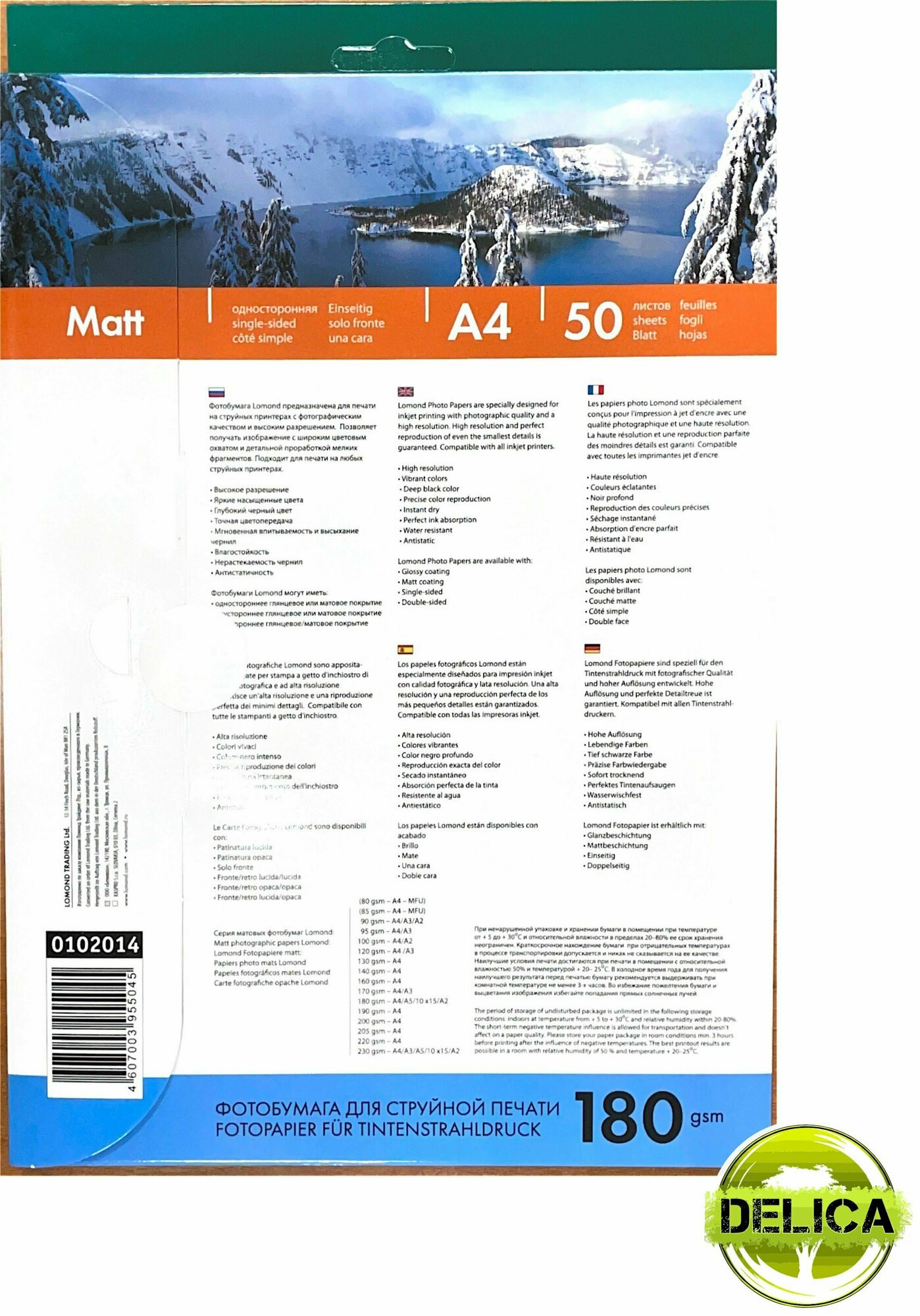 Фотобумага А4, 180 г/м2, 50 листов, односторонняя, матовая, LOMOND, 0102014