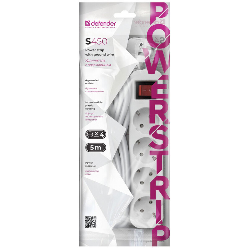 Удлинитель Defender S450, 4 розетки, с заземлением, выключатель, 5м, белый (арт. 262244)
