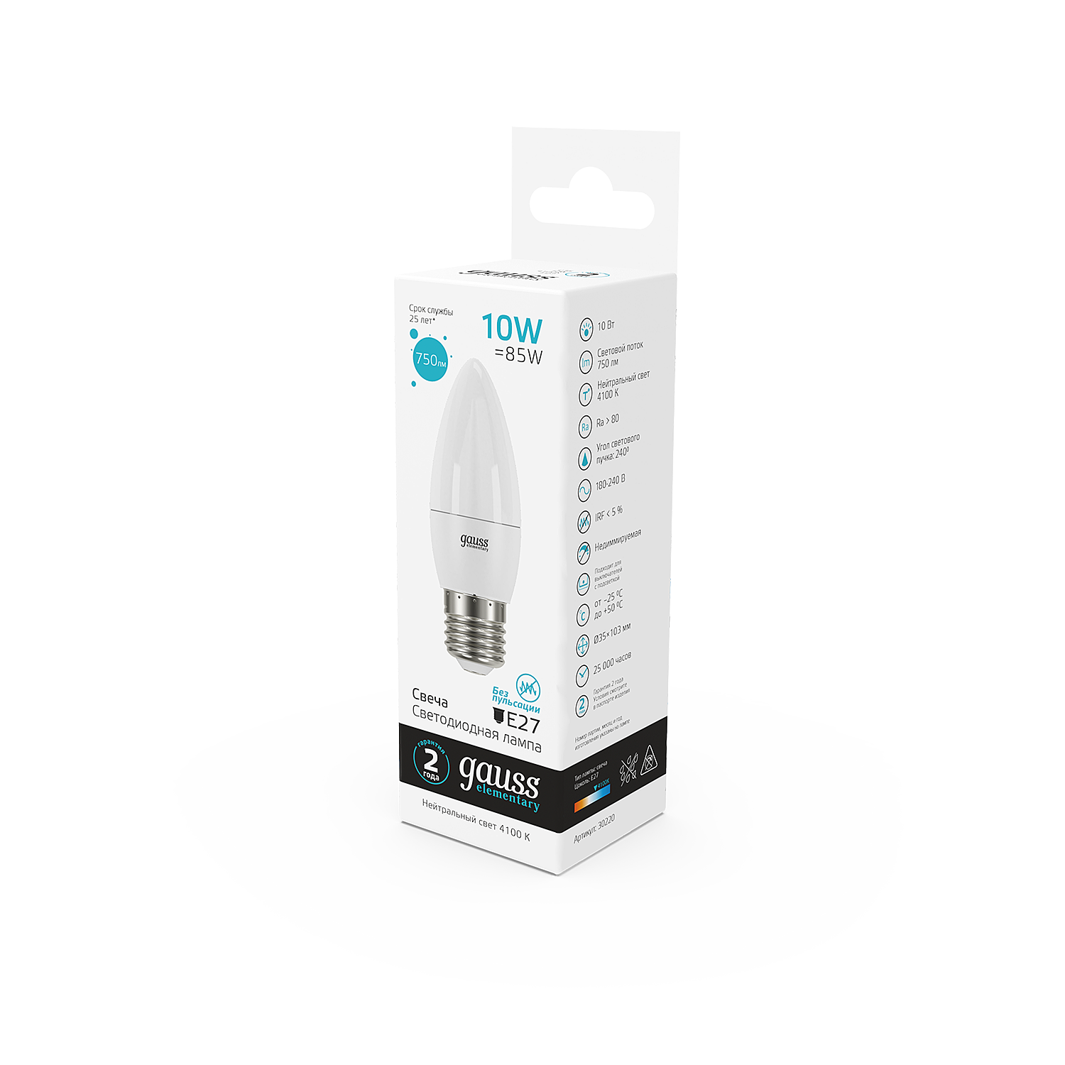 Лампа Elementary Свеча 10W 750lm 4100K E27 LED, GAUSS 30220 (1 шт.)