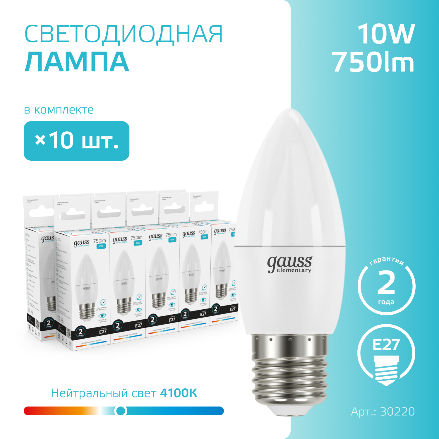Лампочка светодиодная E27 Свеча 10W нейтр-белый свет 4100К упаковка 10 шт. Gauss Elementary
