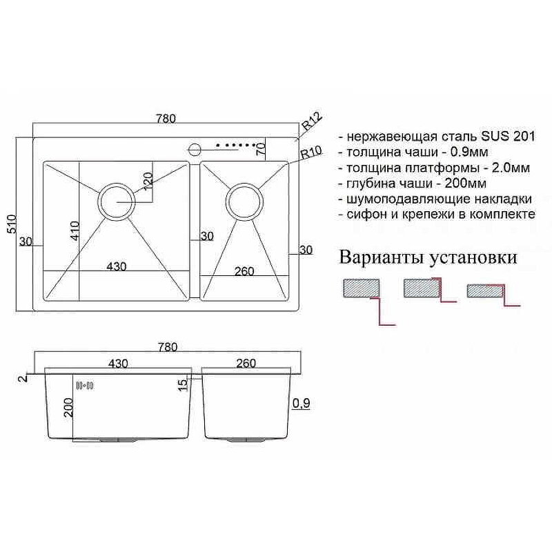 | Особенности | дополнительная чаша / корзинчатый вентиль / отверстие под смеситель / сливная арматура |