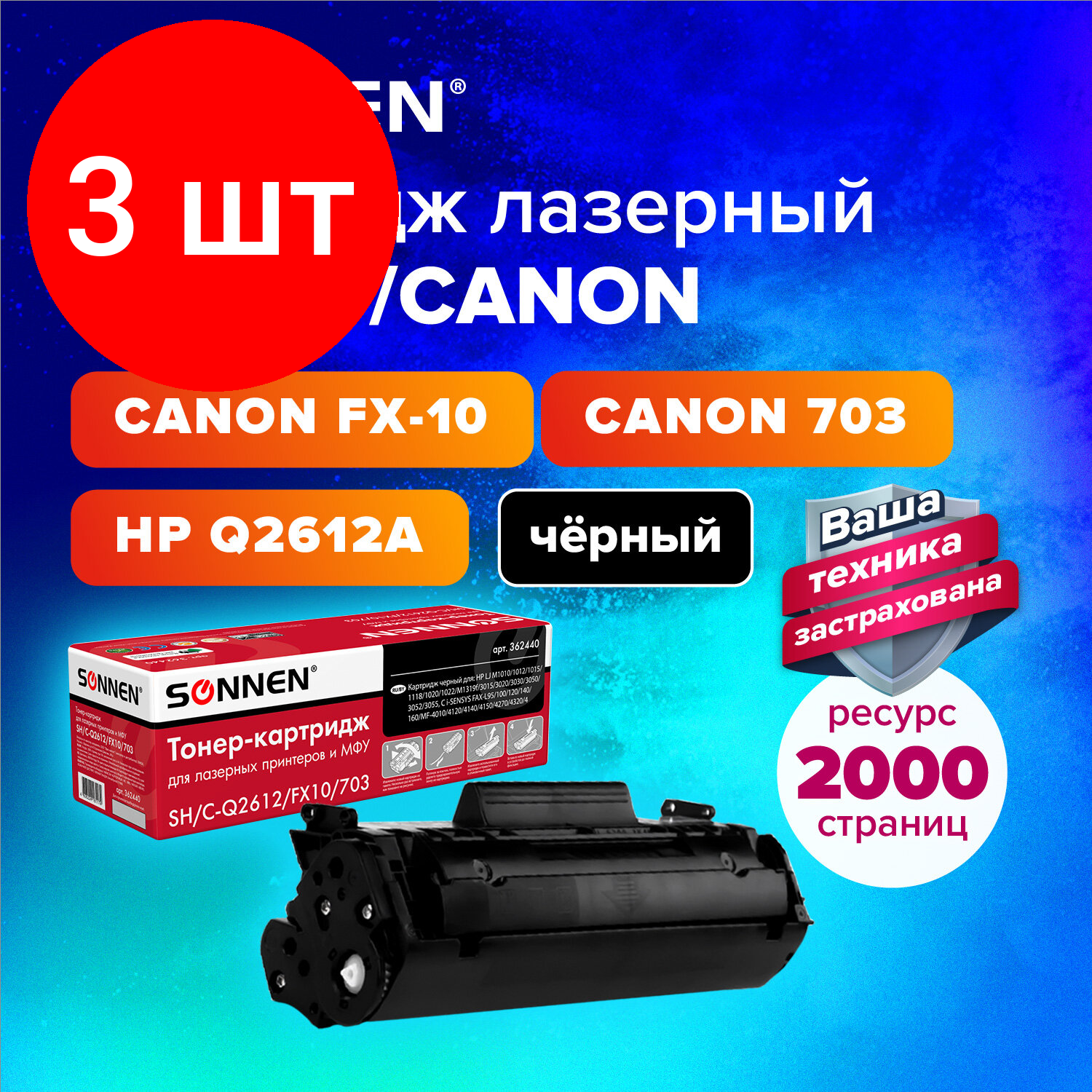 Купить Комплект 3 шт, Картридж лазерный SONNEN (SH/C-Q2612/FX10/703) для HP/CANON Laser Jet/i-SENSYS, высшее качество, ресурс 2000 стр., 362440