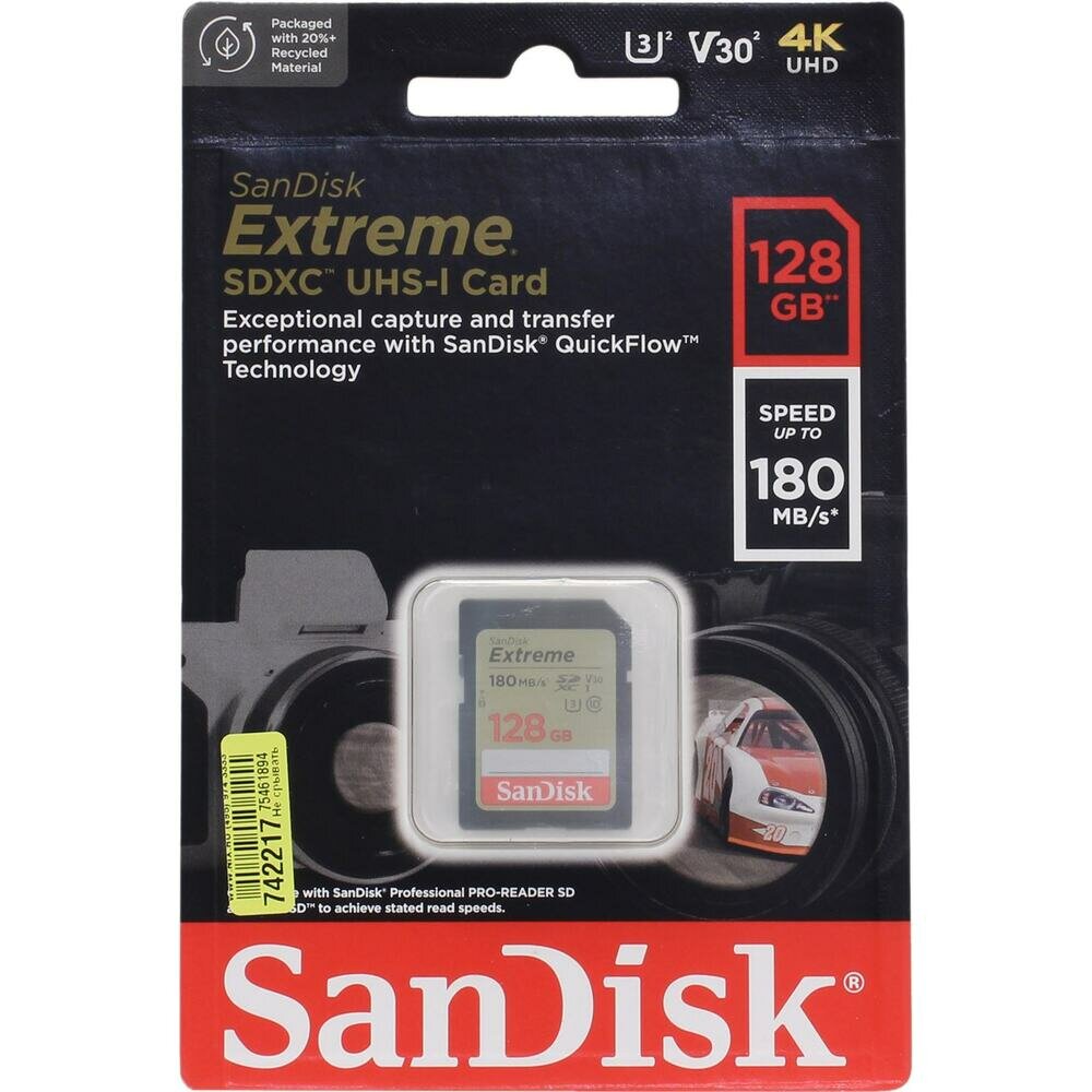 Карта памяти SanDisk Extreme SDXC 128 ГБ Class 10 UHS-I U3 V30 (R/W 180/90 Mb/s)