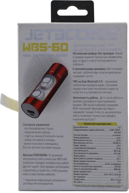 Ниже Вы можете прочитать отзывы на Беспроводные TWS BLUETOOTH наушники JETACCESS WBS-60 бело-красный (BT5.0,сенс.упр.,800mAh, powebank), ознакомится с подробными характеристиками, посмотреть интересные обзоры и фотографии на Беспроводные TWS BLUETOOTH наушники JETACCESS WBS-60 бело-красный (BT5.0,сенс.упр.,800mAh, powebank).