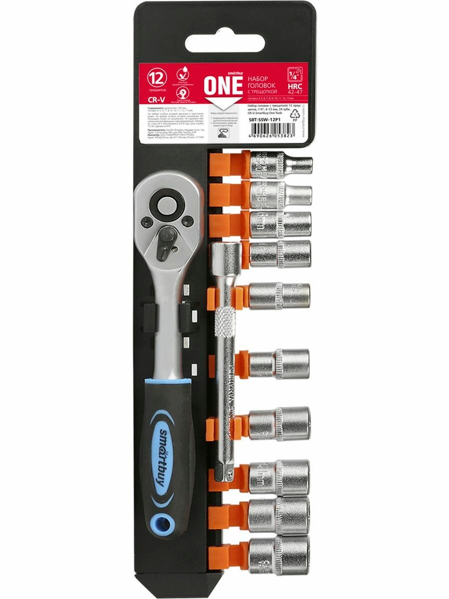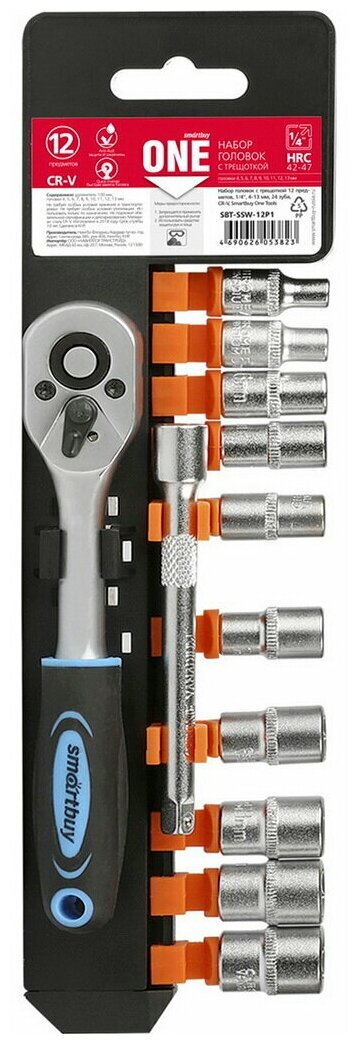 Набор головок с трещоткой 12 предметов, 1/4", 4-13 мм, 24 зуба, CR-V, Smartbuy One Tools