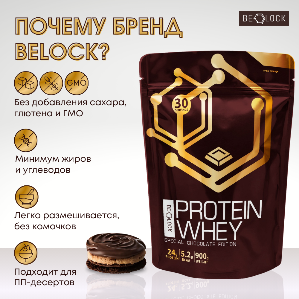 Протеин сывороточный BELOCK, whey protein, протеиновый коктейль без сахара, шоколад, 900 гр, 30 порций
