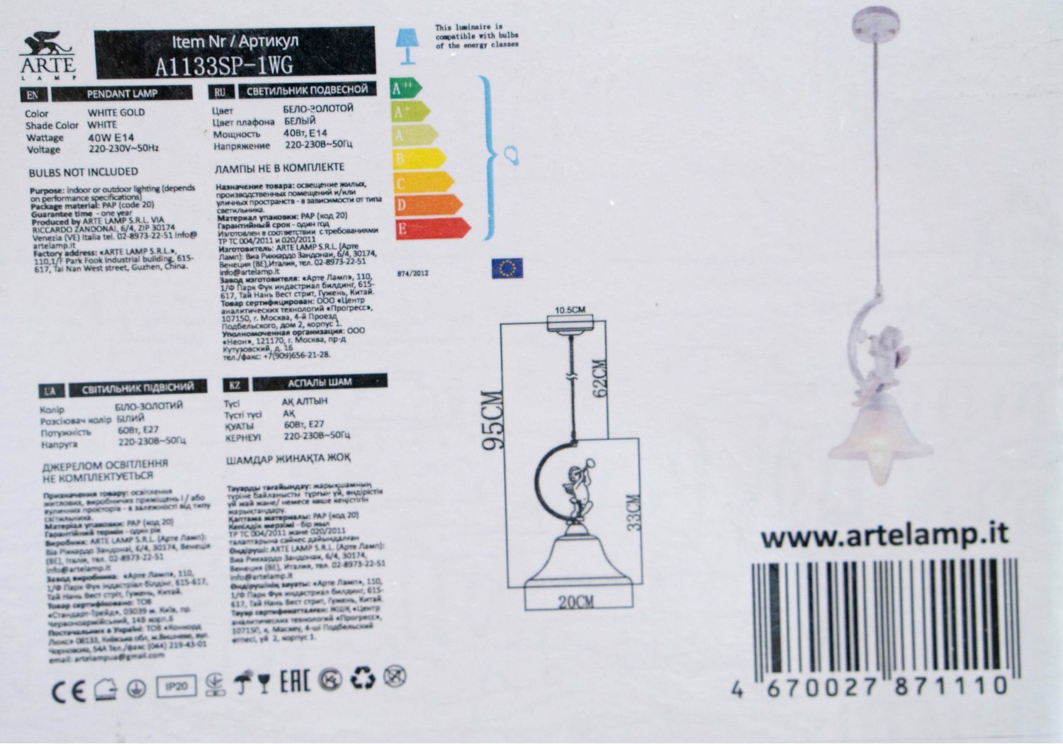 Ниже Вы можете прочитать отзывы на Светильник подвесной ангел Arte Lamp A1133SP-1WG AMUR, ознакомится с подробными характеристиками, посмотреть интересные обзоры и фотографии на Светильник подвесной ангел Arte Lamp A1133SP-1WG AMUR.