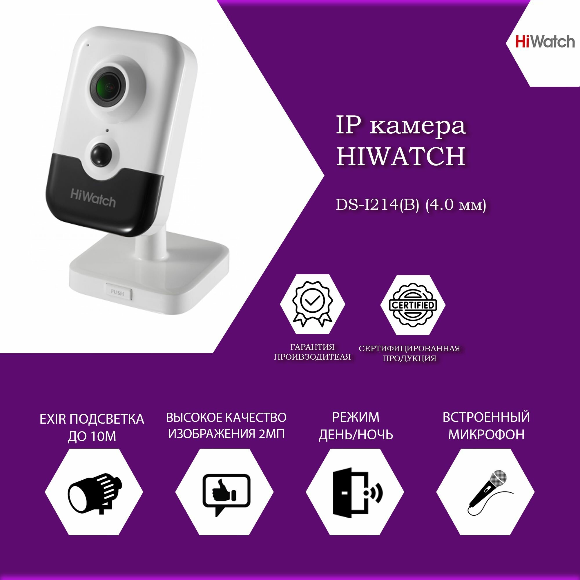 Купить 2 Мп компактная IP-камера Hiwatch DS-I214(B) (4.0 мм) с EXIR-подсветкой до 10м и микрофоном