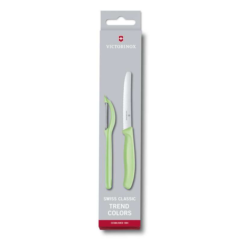 | Комплектация | Набор из 2-х кухонных ножей VICTORINOX Swiss Classic Trend Colors: нож для томатов с волнистой заточкой 11 см; универсальная овощечистка с двойным поворотным лезвием и с серрейторной кромкой; подарочная коробка. |