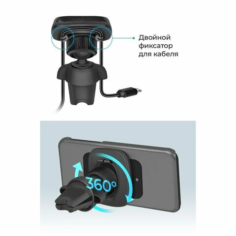 поворот устройства - 360°; металлические пластины для крепления смартфона на держателе в комплекте
