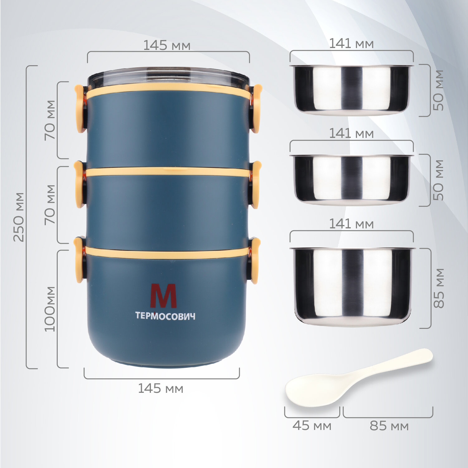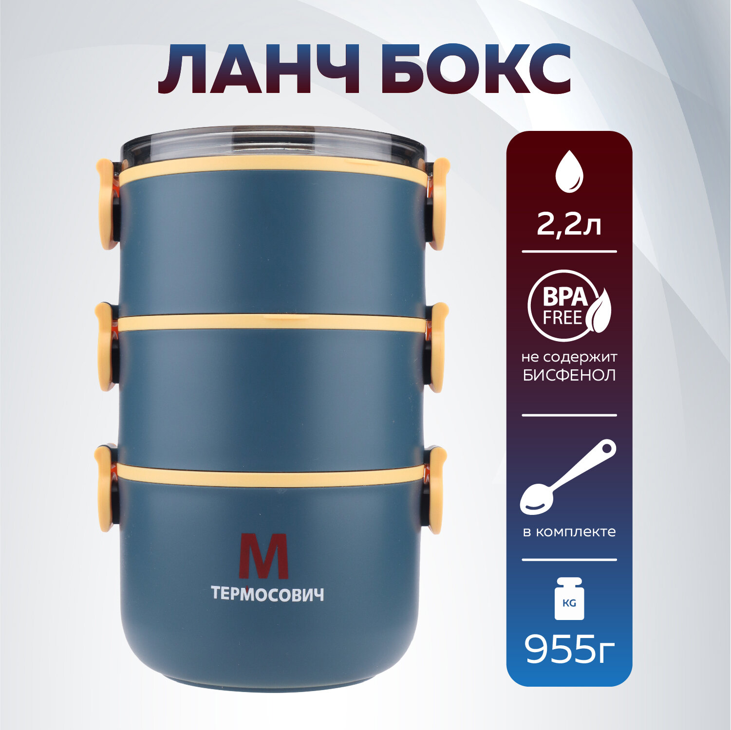 Ланч бокс (контейнер) для еды 2,2 л, синий, ложка, 3 секции, Термосович
