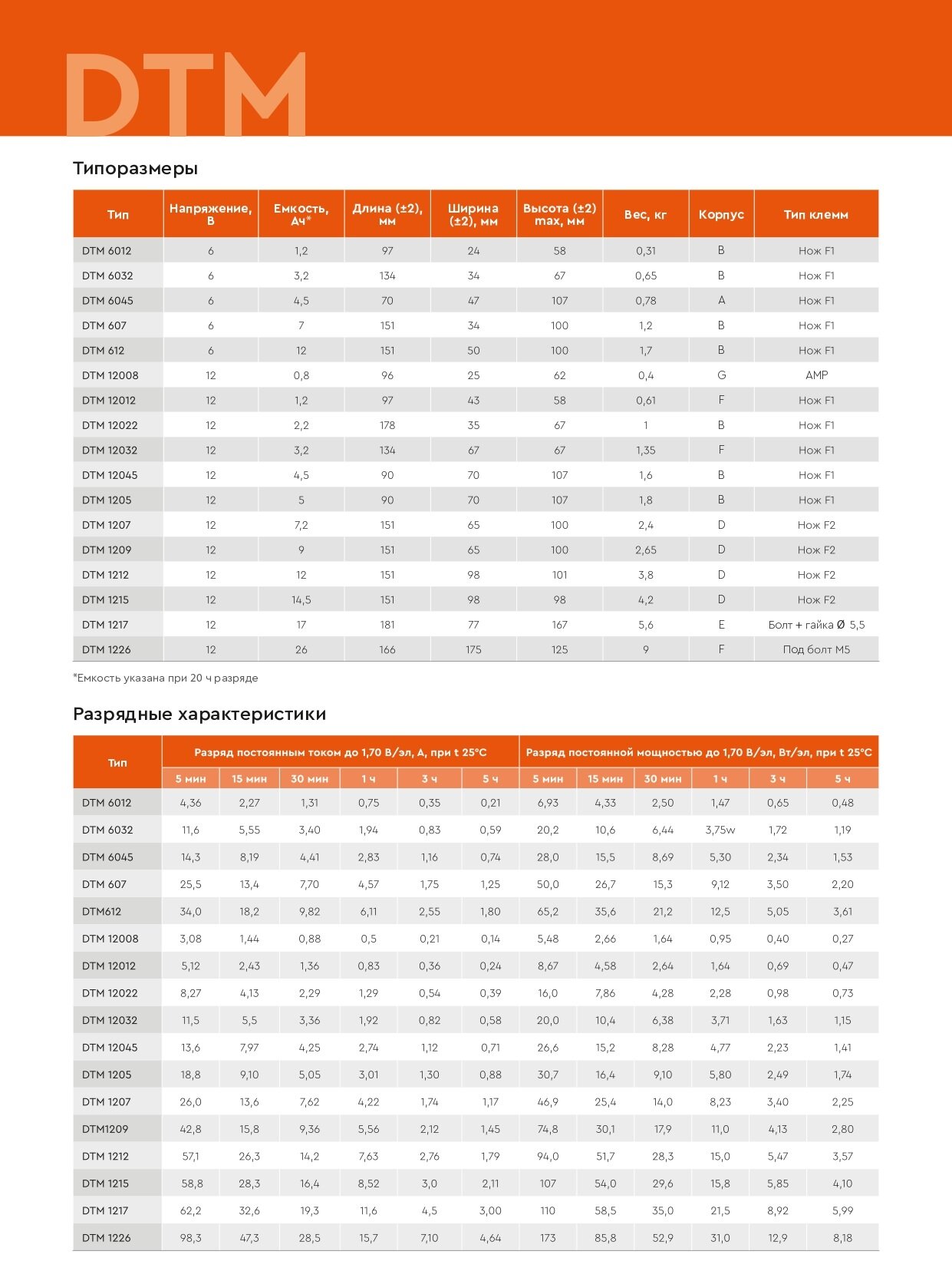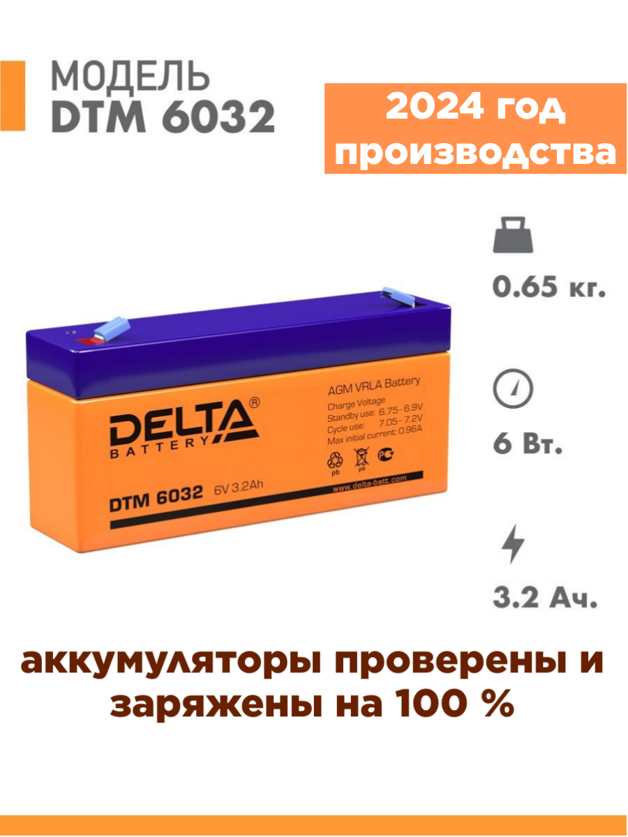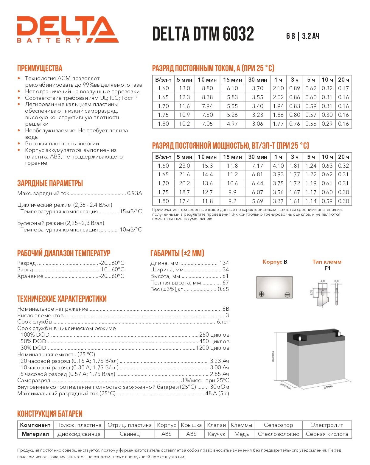 | Дополнительная информация | Аккумулятор Delta DTM 6032 полностью герметизирован, утечка из него электролита (кислоты) невозможна. Поэтому его можно транспортировать и использовать в любом удобном положении (вертикальном или горизонтальном). У батареи DTM 6032 отсутствуют ограничения на перевозку по автомобильным дорогам, по воздуху, по морю и по железной дороге |