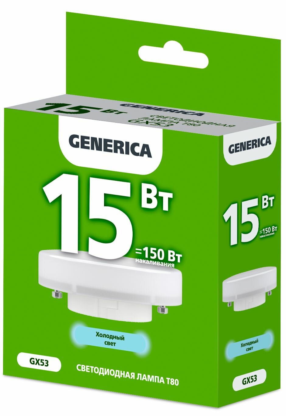 (12 шт.) Светодиодная лампочка GENERICA LED T80 таблетка, мощность 15 Вт, напряжение питания 220 В, цветовая температура 6500 К, Холодный белый свет, цоколь GX53, размер 73х28 мм