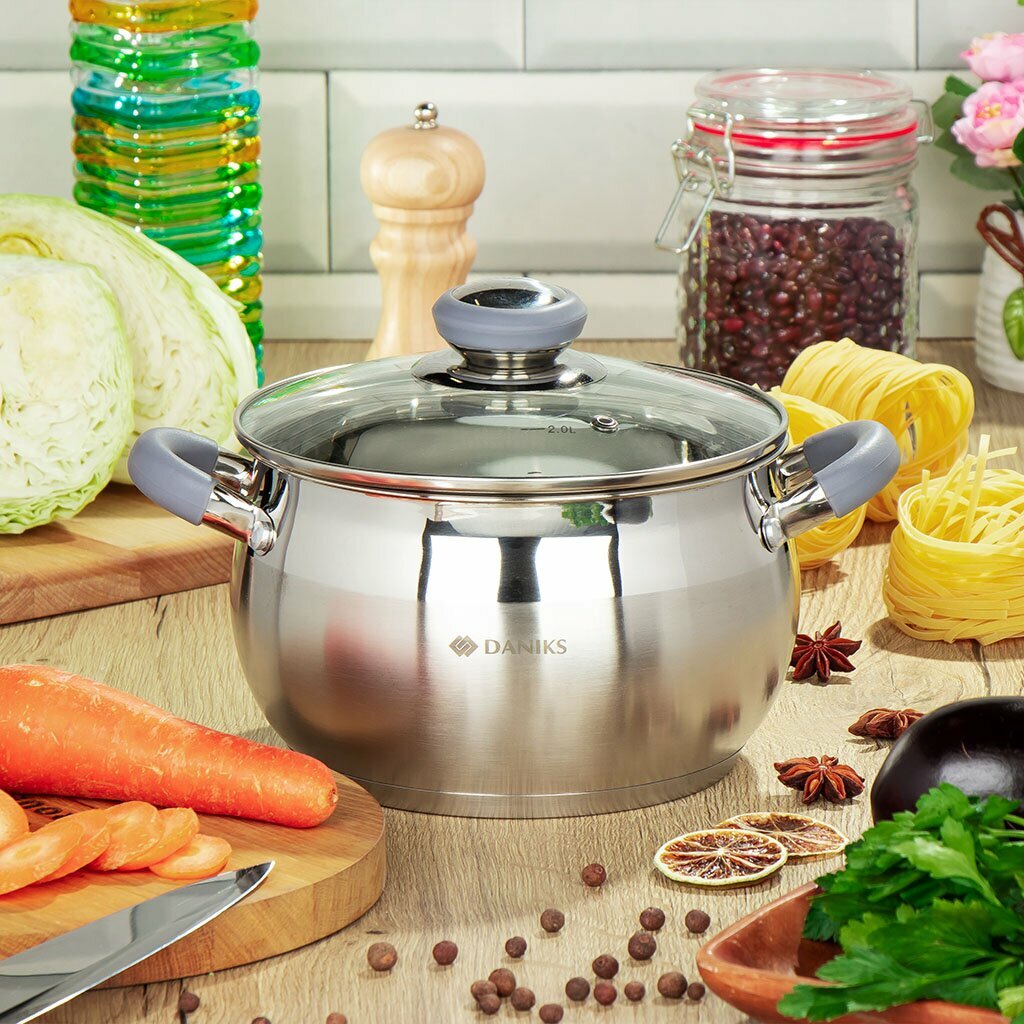 Кастрюля нержавеющая сталь, 2.9 л, с крышкой, крышка стекло, Daniks, Модерн серый, SD-18N, индукция интересное: