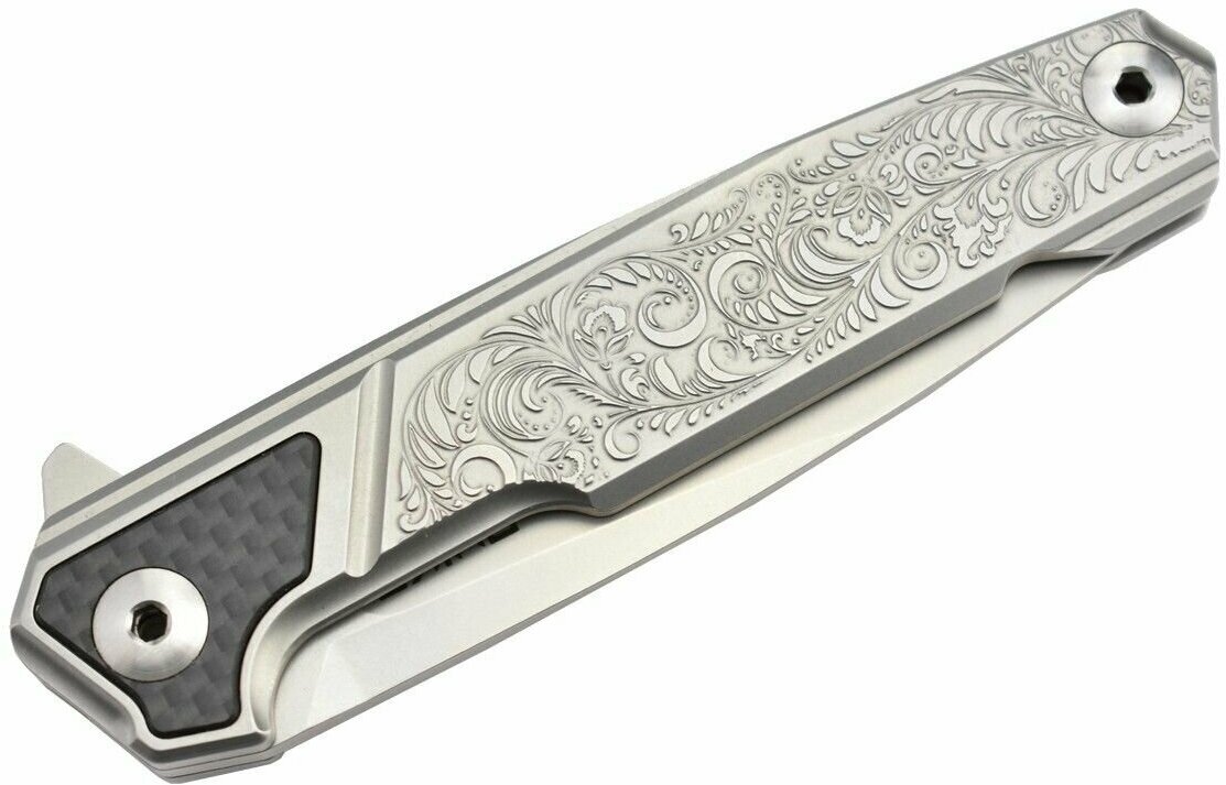 У него рукоять с рисунком таким, что кажется, что он ручной работы и его цена уже пятизначная))) А на практике подкупает заводским идеальным исполнением Есть похожая модель у Райка с титаном, тут же идет стандарный и хороший сэндвик В общем рекомендую, мало кто останется равнодушным увидев его в живую |