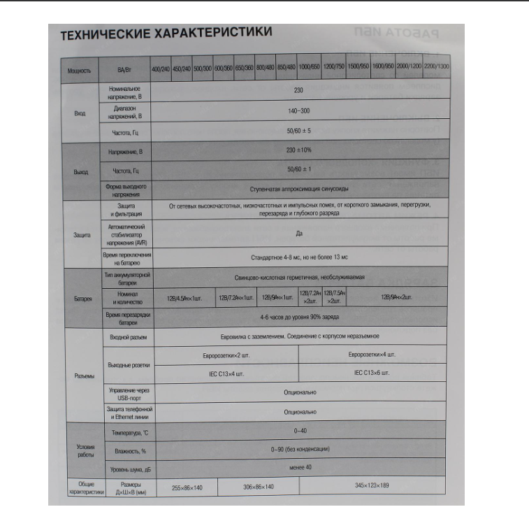 | Время переключения на батарею | 4 мс |
