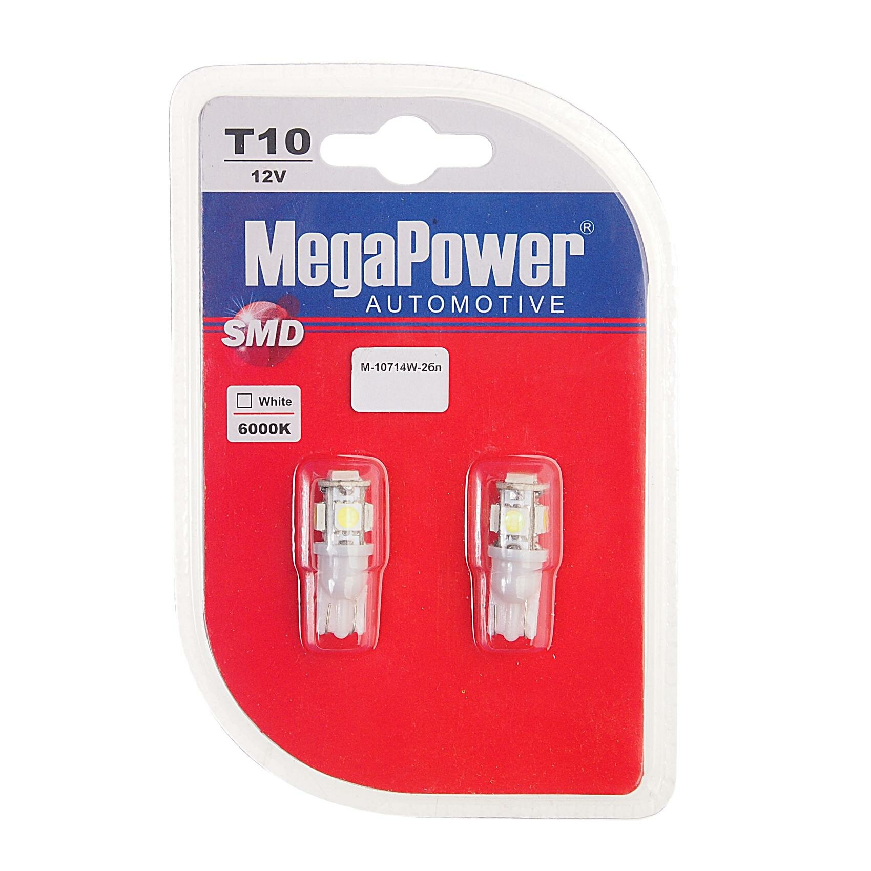 Лампа светодиодная 12V W5W T10 W2.1x9.5d 6000K 5 блистер (2шт.), 10714W-2бл, MEGAPOWER-AUTOMOTIVE