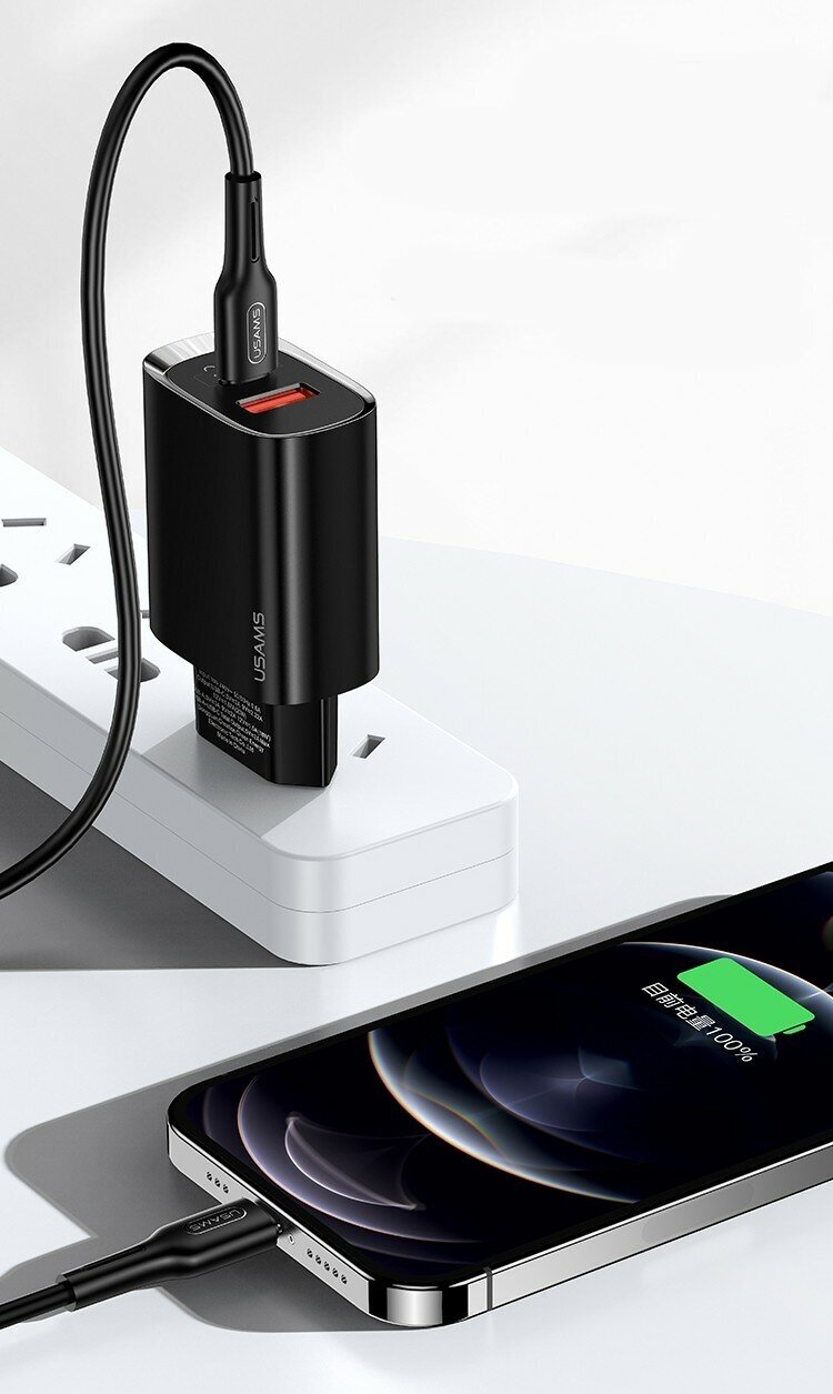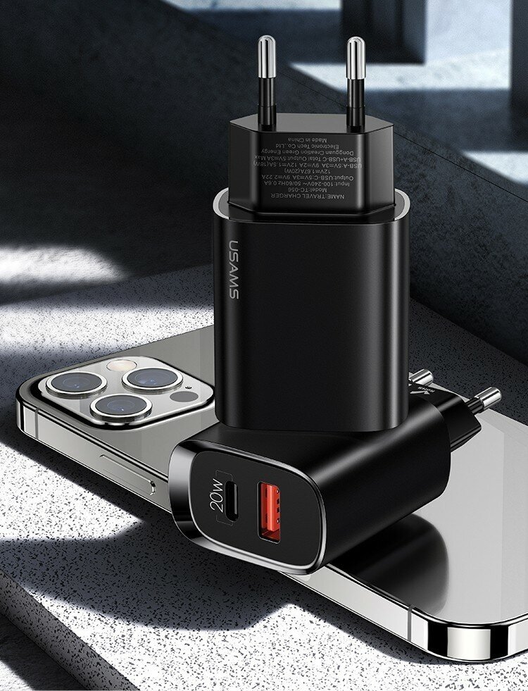 Сетевое зарядное устройство Usams CC121 с функцией одновременной быстрой зарядкой двух устройств Fast Charger QC 3.0 + PD 3.0, 20W, адаптер для iPhone 12 с Type C и USB портами. Цвет - чёрный