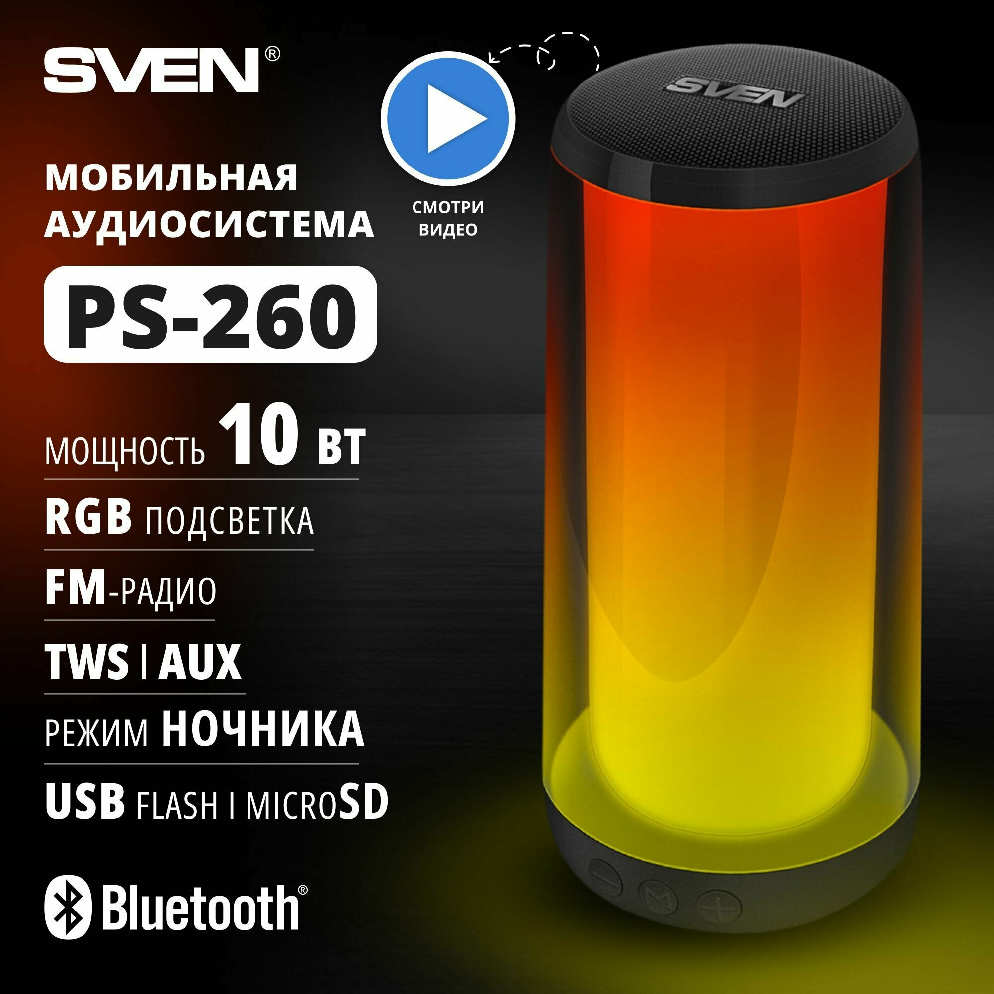 Портативная колонка Sven PS-260, 10 W, Bluetooth, FM, USB, microSD, подсветка, черный (SV-021337)