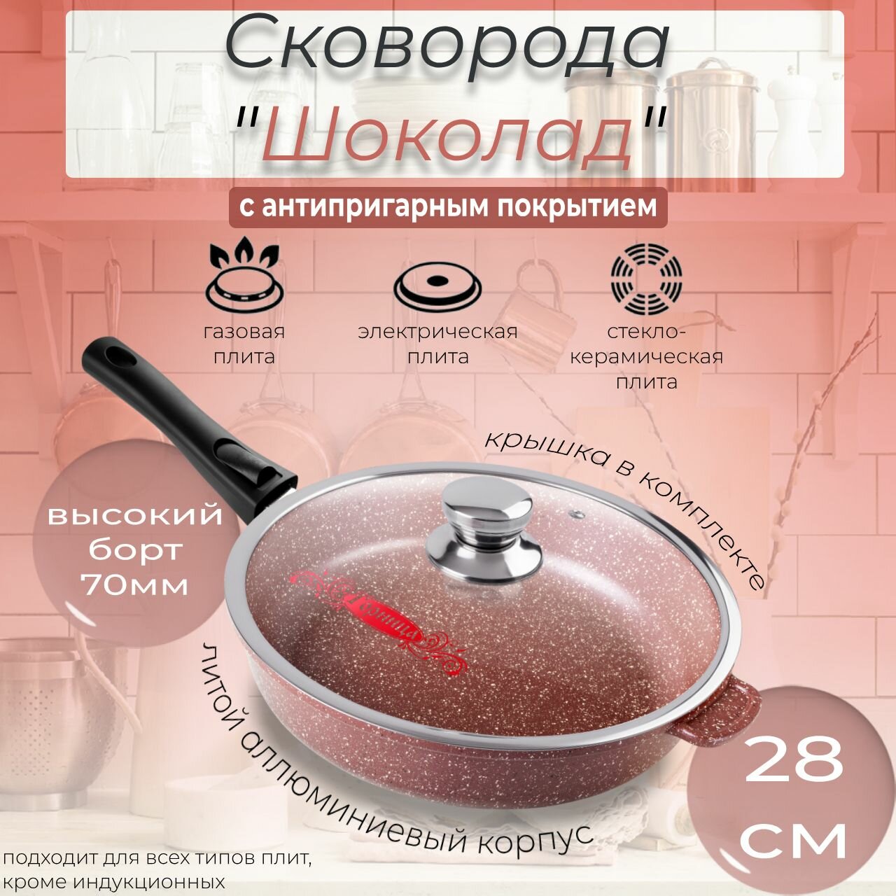Сковорода 28 см, съемная ручка (софт тач), с крышкой, подарочная упаковка, серия Шоколад Горница
